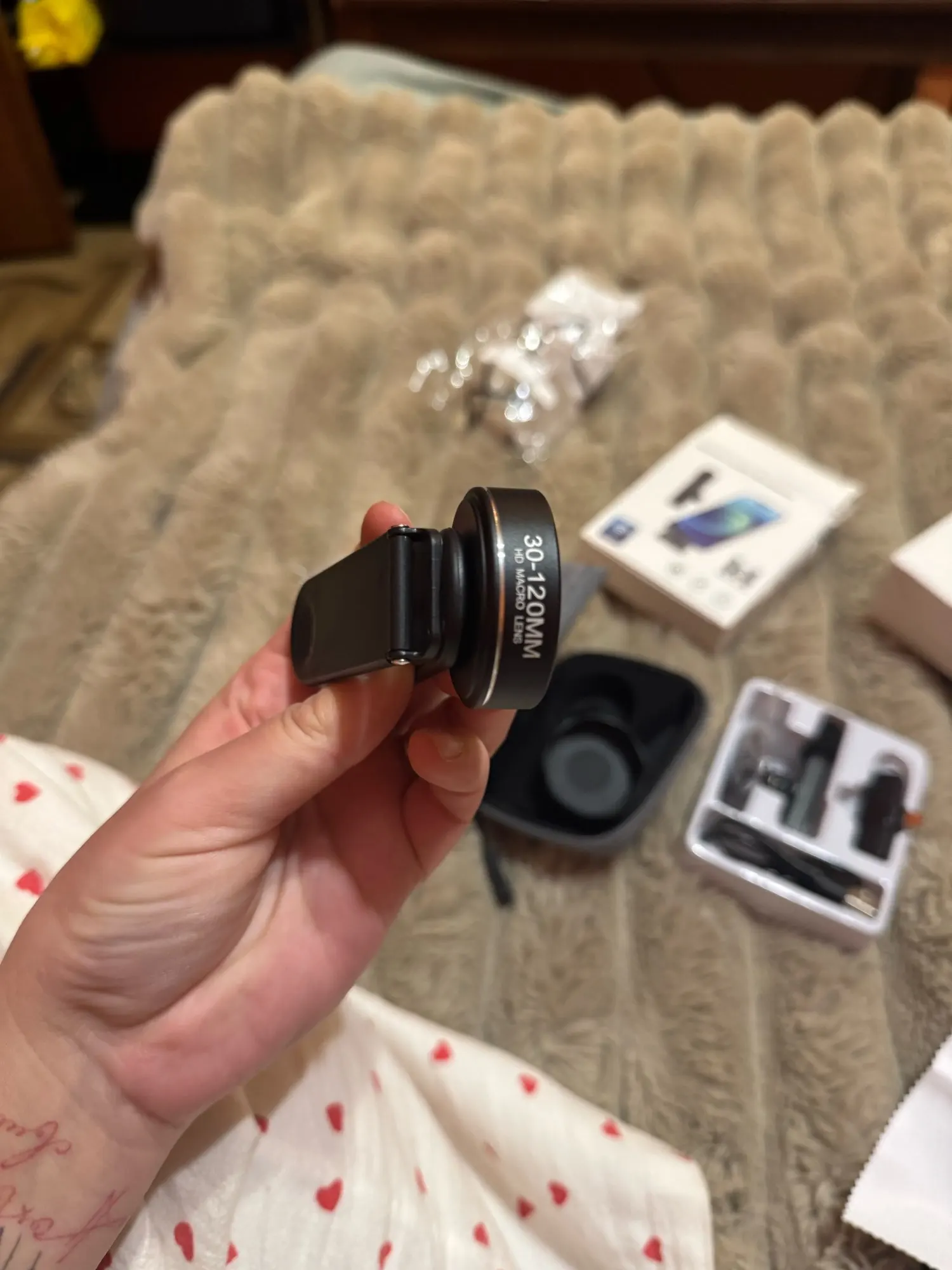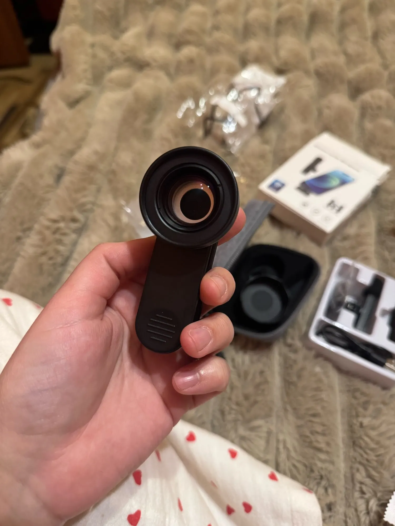 Very good macro lens for manicures. It grips four fingers very well. I just didn't like the clip. It covers half of the lens opening. A circle appears around the photo. It arrived quickly.