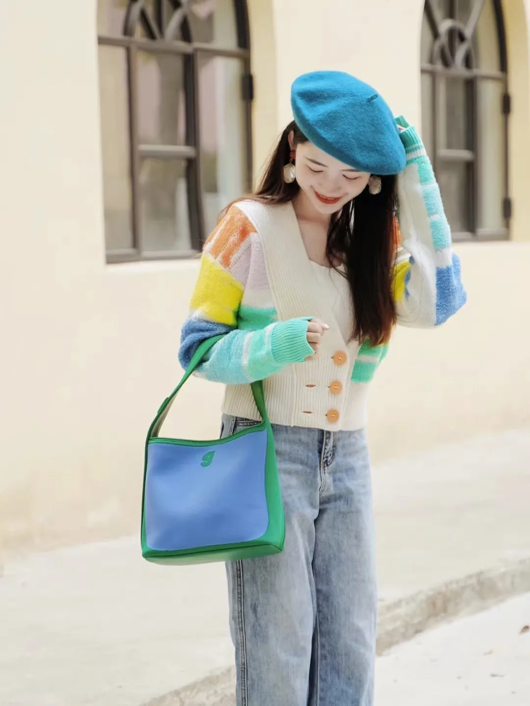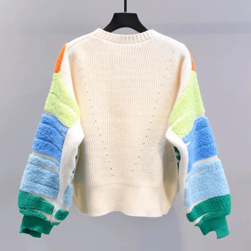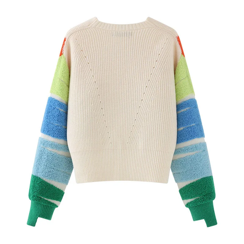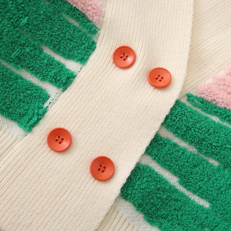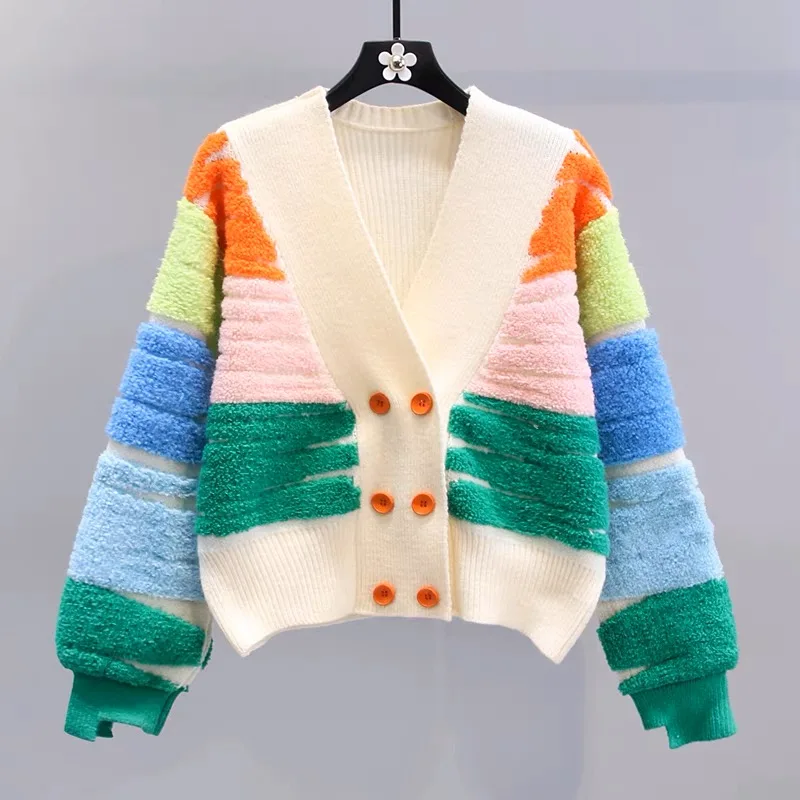 Regenbogen-Strickjacke mit Streifen für Damen – Zweireihiger Pullover mit V-Ausschnitt