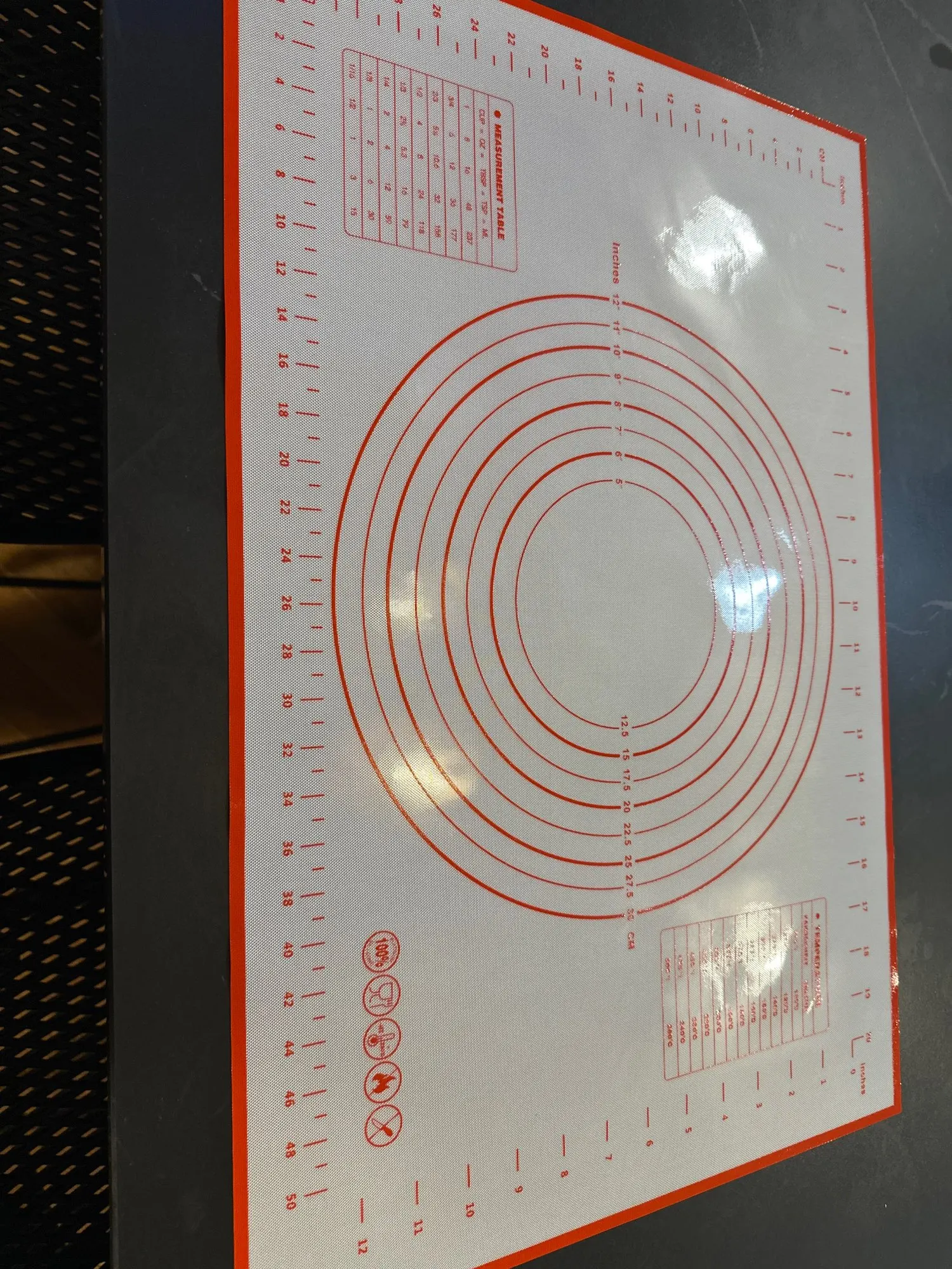 A very comfortable surface for working in the kitchen, I worked on it with very sticky dough and nothing stuck to the surface. From below it sticks well to the marble and doesn't slip or move. Also convenient for washing. Recommended. Arrived quickly and nicely packaged.