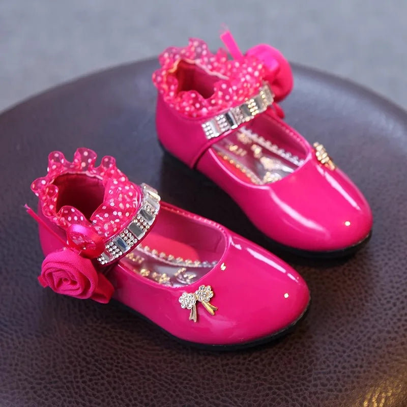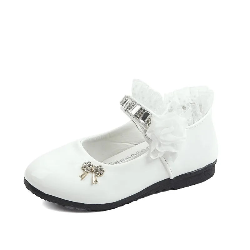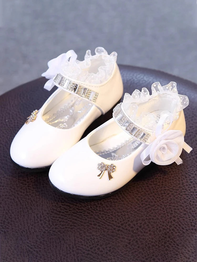 Chaussures en cuir PU avec dentelle fleurie, nœud papillon et strass