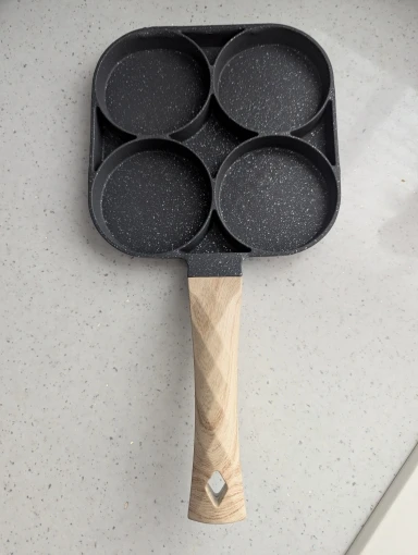 I recently started using this small frying pan with four egg circles, and it’s been a fun little upgrade in my kitchen! The four built-in rings make cooking eggs so easy — they keep each one neat and evenly shaped, which is perfect for breakfast sandwiches or meal prepping. The pan heats up quickly and distributes heat evenly, so nothing sticks (especially with a bit of oil or non-stick spray).