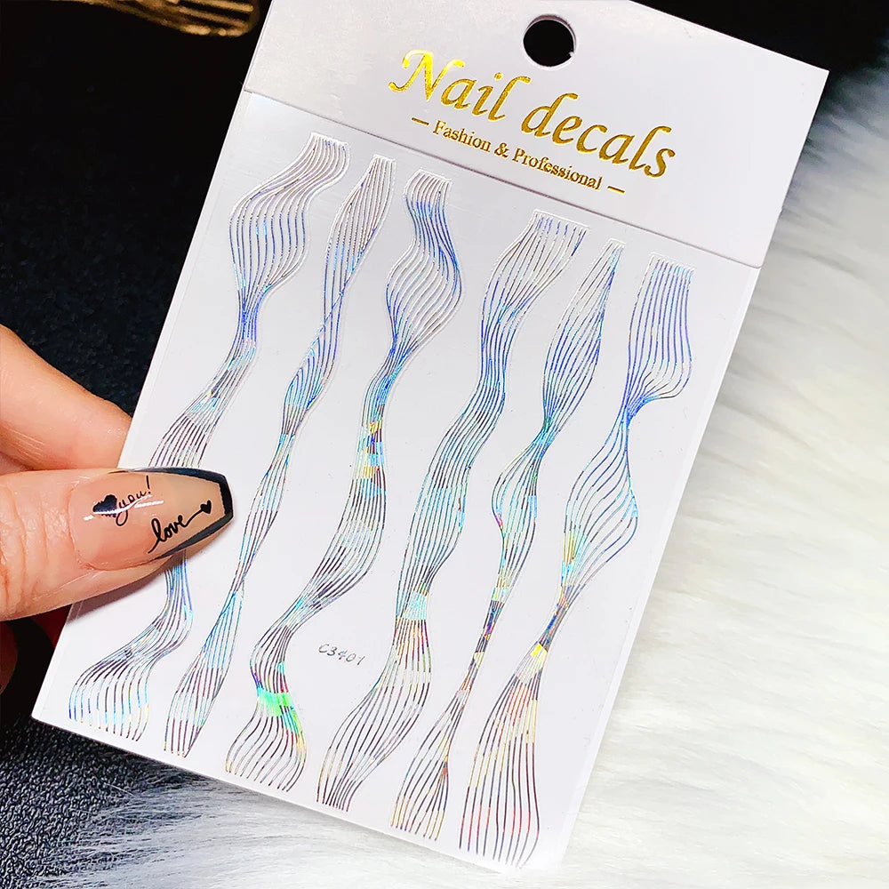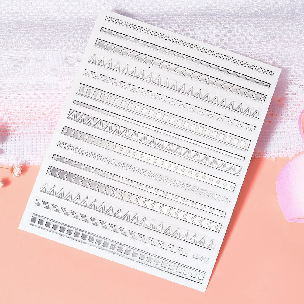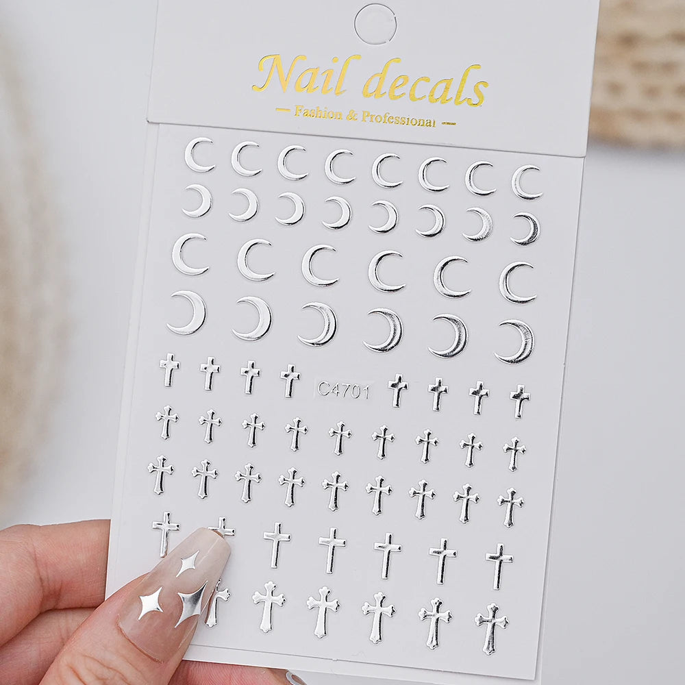 6 feuilles d'autocollants pour ongles métallisés argentés – décalcomanies pour nail art autocollantes en forme de cœur et de chaîne d'étoiles 3D