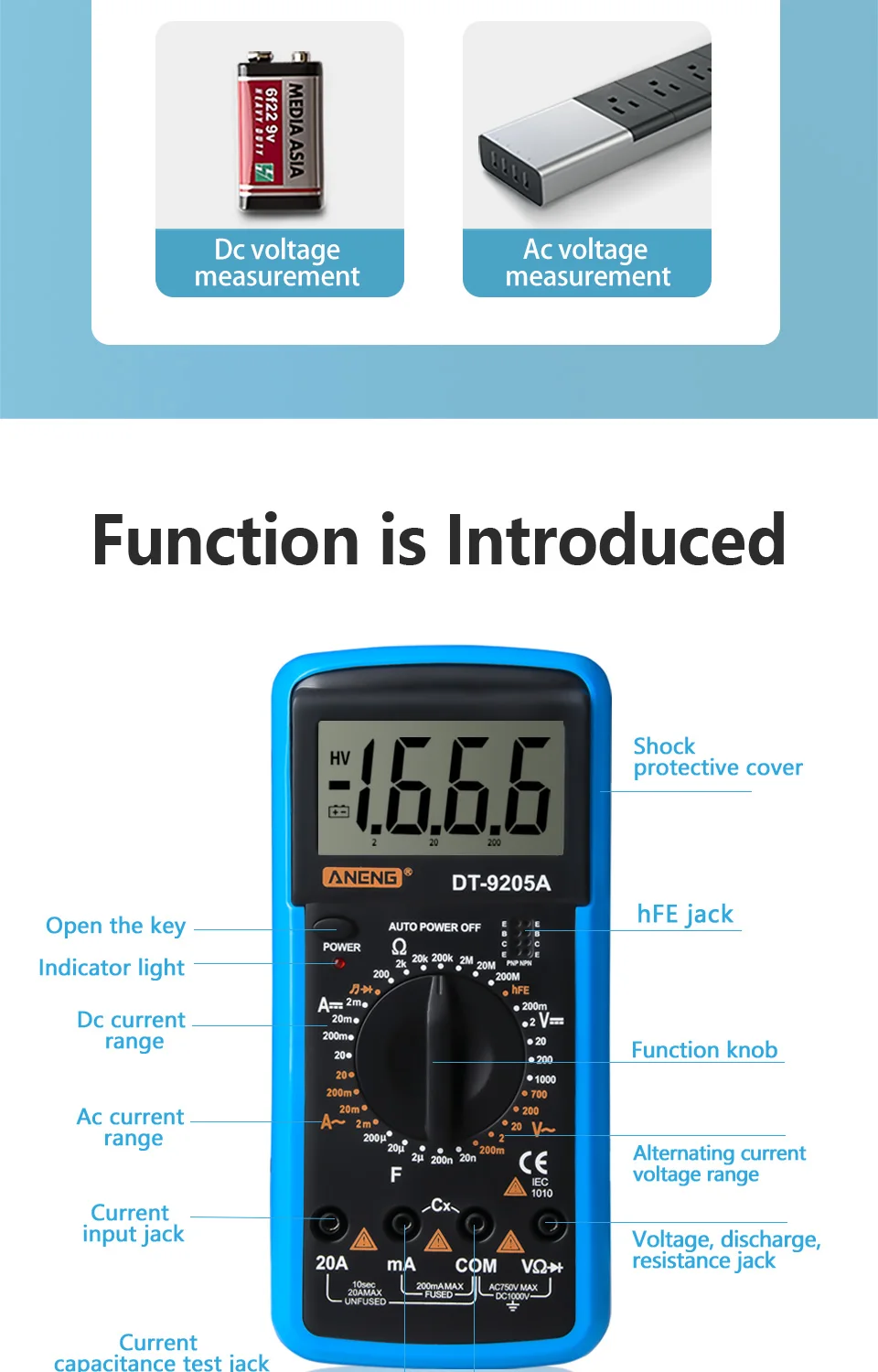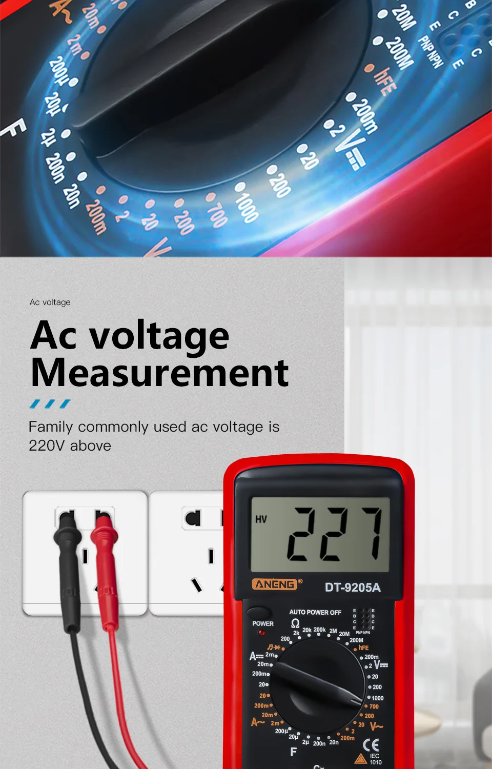 Multimètre numérique DT9205A - Testeur de tension de transistor AC/DC