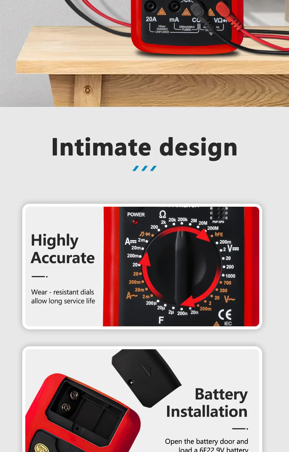 Ce compteur est un multimètre numérique portable 31/2 pour mesurer la tension AC/DC, le courant AC/DC, la résistance, la diode, le transistor, la fréquence, la température, la capacité et le test de continuité avec fonctionnement sur batterie. Le rétroéclairage de l'écran est facultatif.