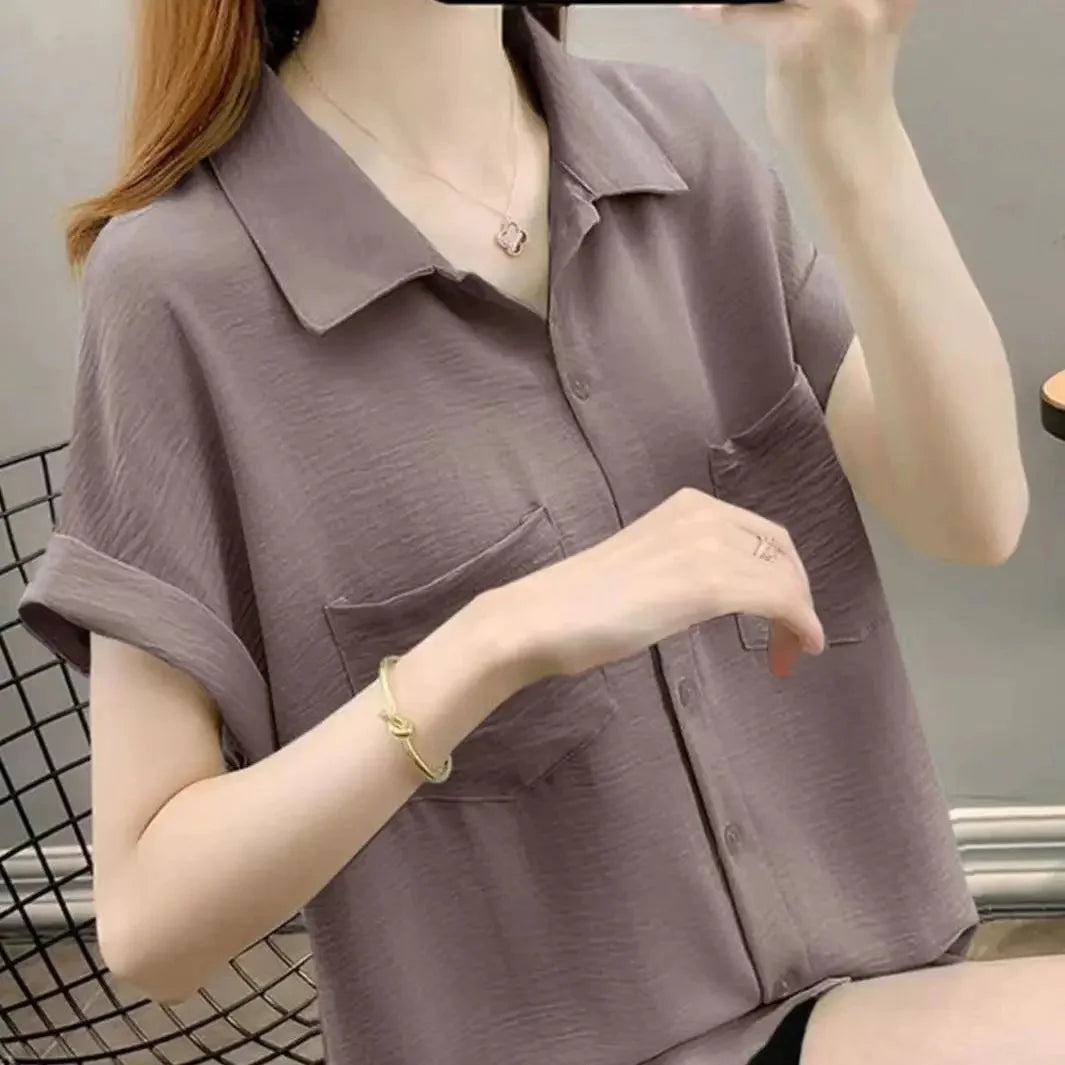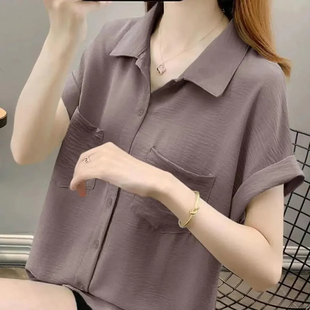 Chemise fine en mousseline de soie à manches courtes et coupe ample pour femme