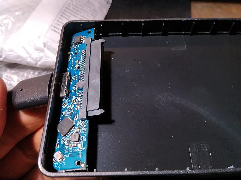 Everything is in order, the product matches the description. The configuration is correct, and the read/write speed is consistent with the stated speed. When installing a drive or hard disk into the enclosure, first insert the cable into the connector, then lift the board using the connector up, as shown in the photo, then attach the drive or hard disk to the board, and then carefully lower the installed drive or hard disk along with the board. This way you won't break anything when installing the drive or hard drive. Next, glue the strip to the opposite cover to hold the drive or hard drive so that it does not hang out in the case! That's it! Good luck to all! Thanks!