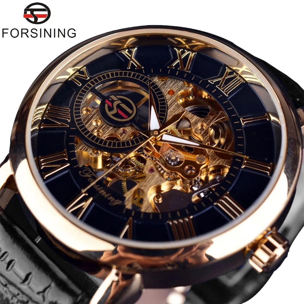 3D Logo Design Skeleton Mechanical Watch - Hollow Engraving Black Gold Case Leather Strap