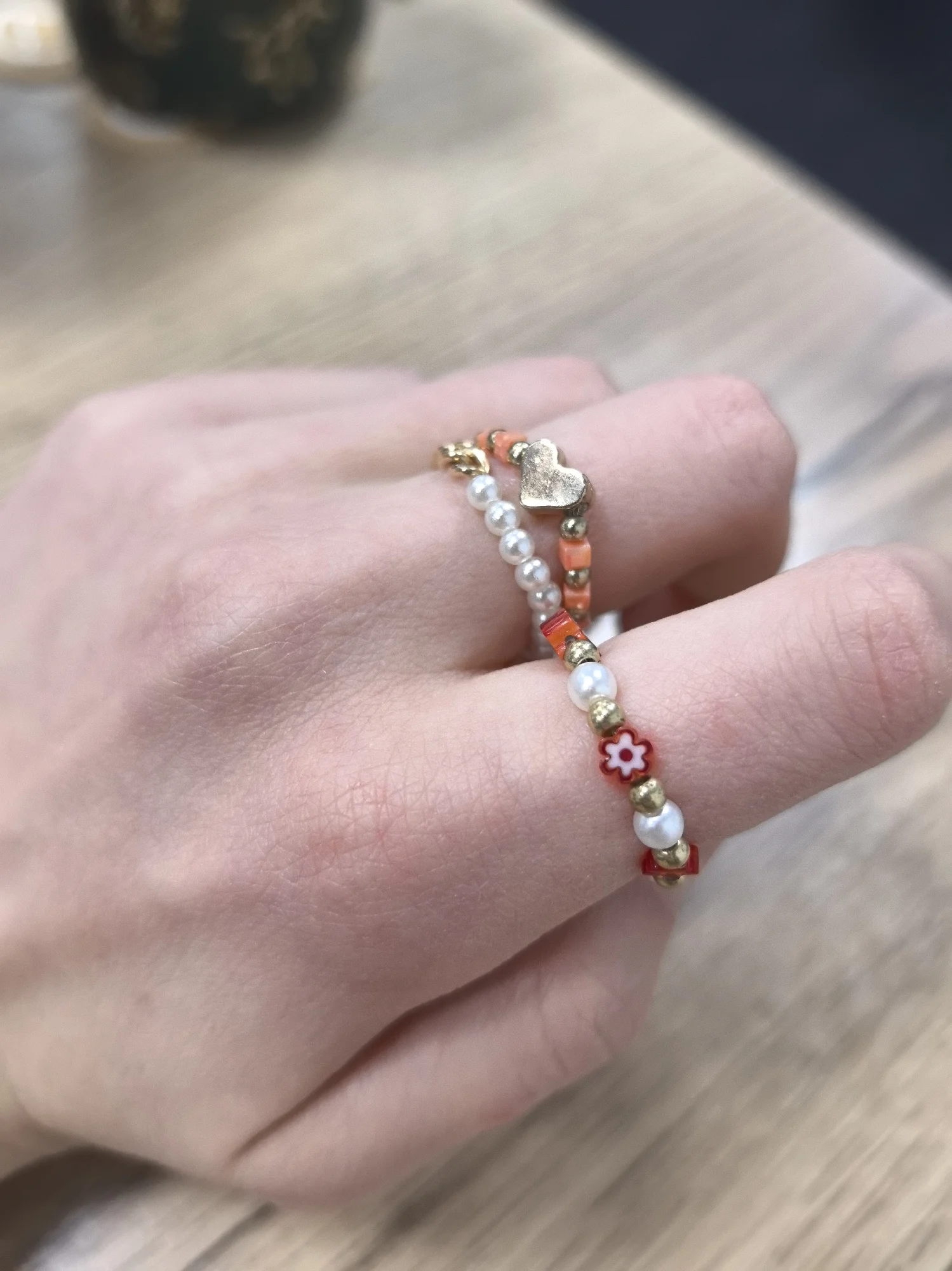 The one with pearls is large, like a size 8-9. The others are 5-6, quite small. If you have thick fingers, they might not fit you, but other than that, they are very cute. They can be adjusted, the material looks good, and I really love them.