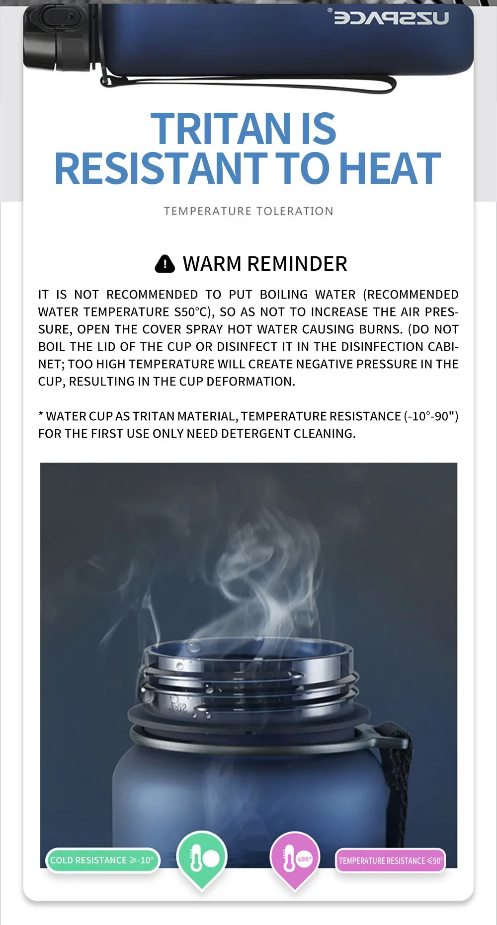 I tested the bottle by pouring in water at 95 ° C. it withstood the heat without any signs of melting or damage. As for whether it contains any harmful chemicals, i have no way of verifying this. Let's be honest - buying from china is largely a matter of hope and trust, as quality control and health standards are unlikely to match those in the eu or the usa. Assuming the product is safe, its appearance and construction suggest that it is a solid and elegant piece of kit. I plan to use it at work when speaking to audiences, and for that purpose, it should serve me very well.