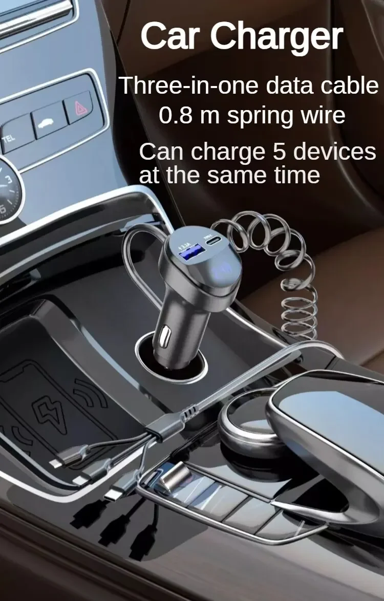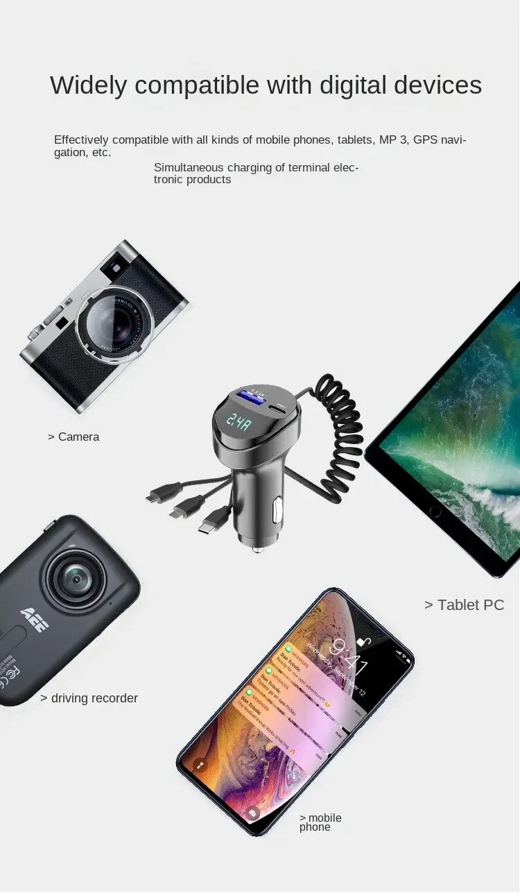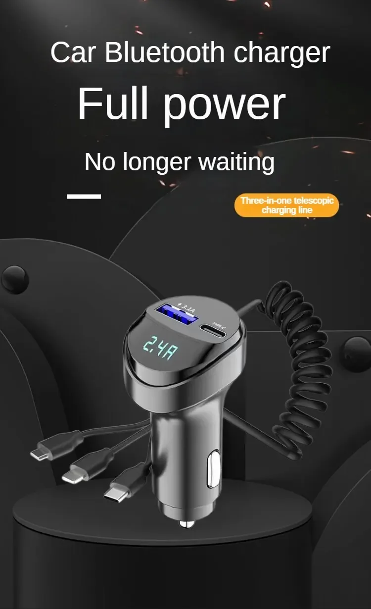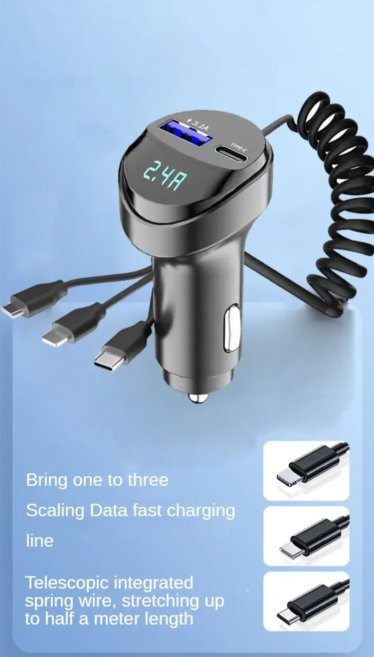 55W 2-Port USB Car Phone Charger 3.1A with Voltage Display Three-In-One USB Retractable Charging Cable