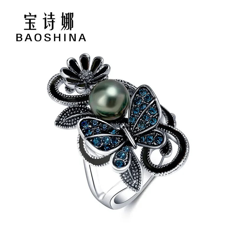 Women's Pearl Butterfly Crystal Ring