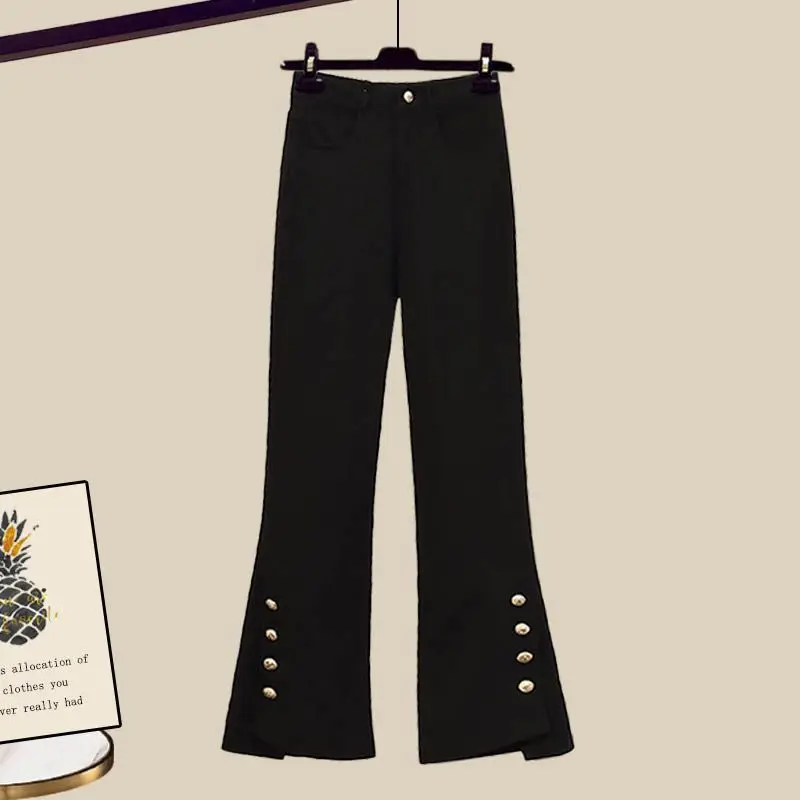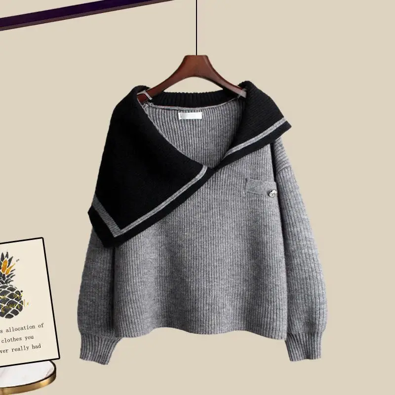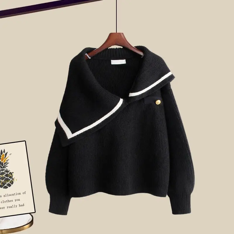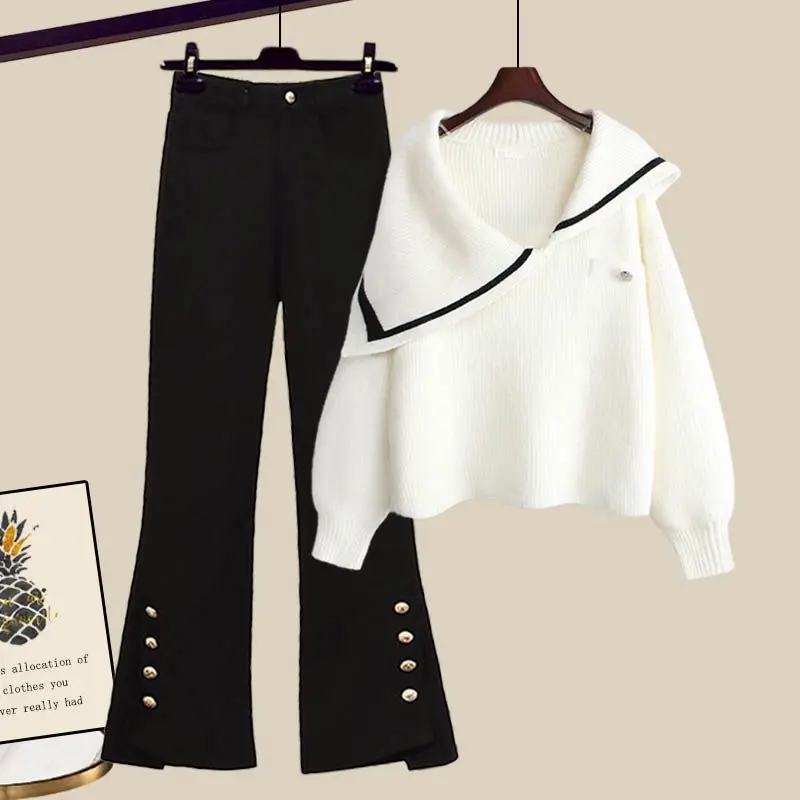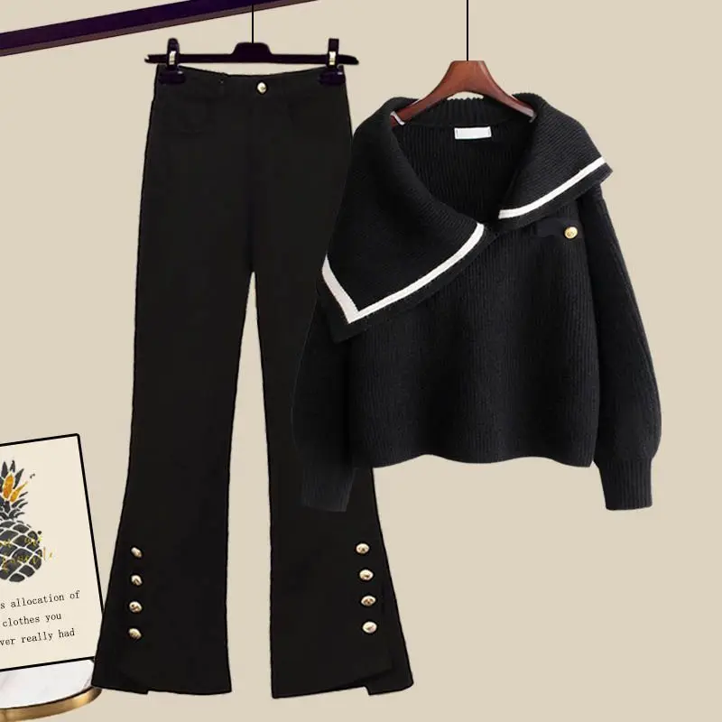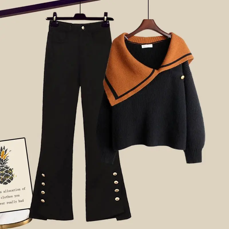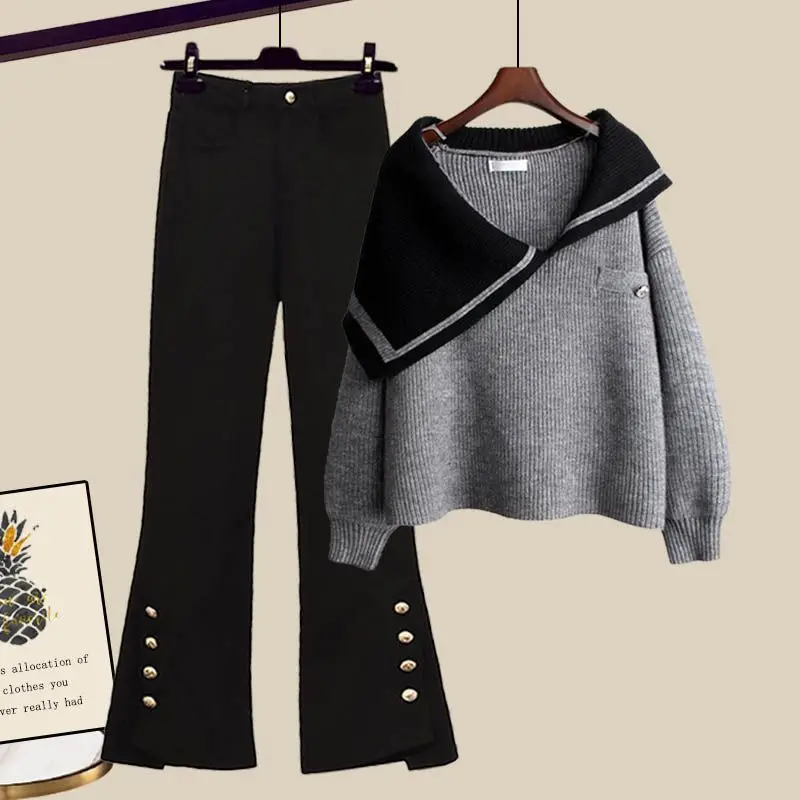 Autumn New Style Lapel Asymmetric Knitted Sweater Casual Wide Leg Trousers Two Piece Set Elegant Women's Pants Set Tracksuit