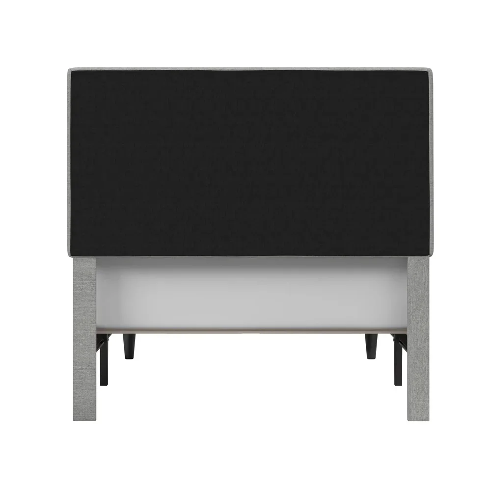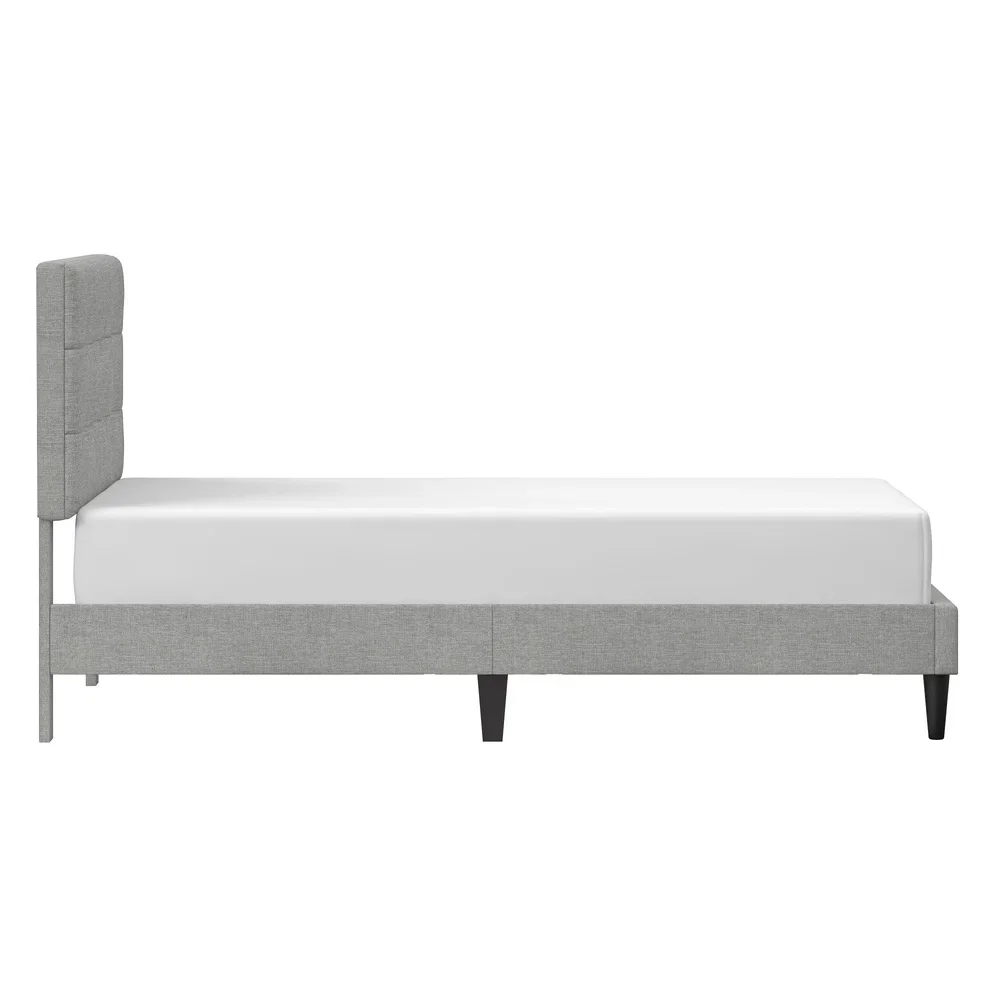 Contemporary modern adult platform bed features eye-catching square tufted headboard Headboard is adjustable with three height options for a customized look Wooden construction upholstered in 100% polyester in light gray; Tapered legs finished in black Overall Dimensions: 41. 5-45. 5H x 43W x 80. 5L Assembly required Item will ship in one box; Most bed components inside the headboard Mattress-ready bed means no box spring or other foundation is required Spot or wipe clean 250 lb. Recommended weight capacity For residential use only